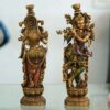 This set of two brass statues depicts a man playing a flute and a woman holding a lotus flower. The statues are likely inspired by Hindu deities, possibly Krishna and Radha, although they lack some of the defining attributes, such as the peacock feather crown Krishna is typically depicted wearing. The statues are made of brass and have a polished finish.